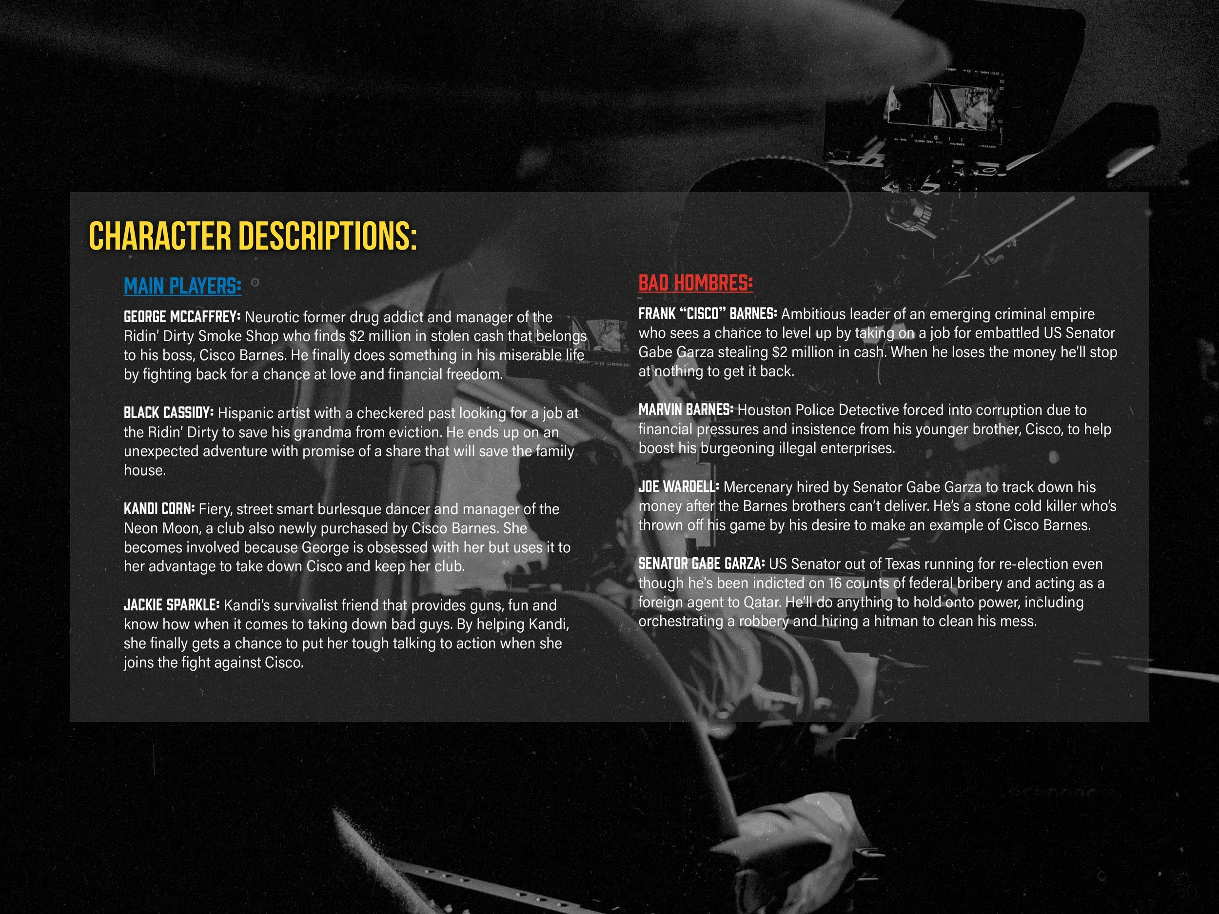 When three unlikely strangers find $2 million in stolen money it sets them on a thrilling adventure dodging criminals, corrupt cops and an embattled US Senator through Houston’s underground. Will they survive the night? In this proof of concept short film we find our antagonists, the Barnes brothers, on their way to steal the big payday that sets our story in motion.